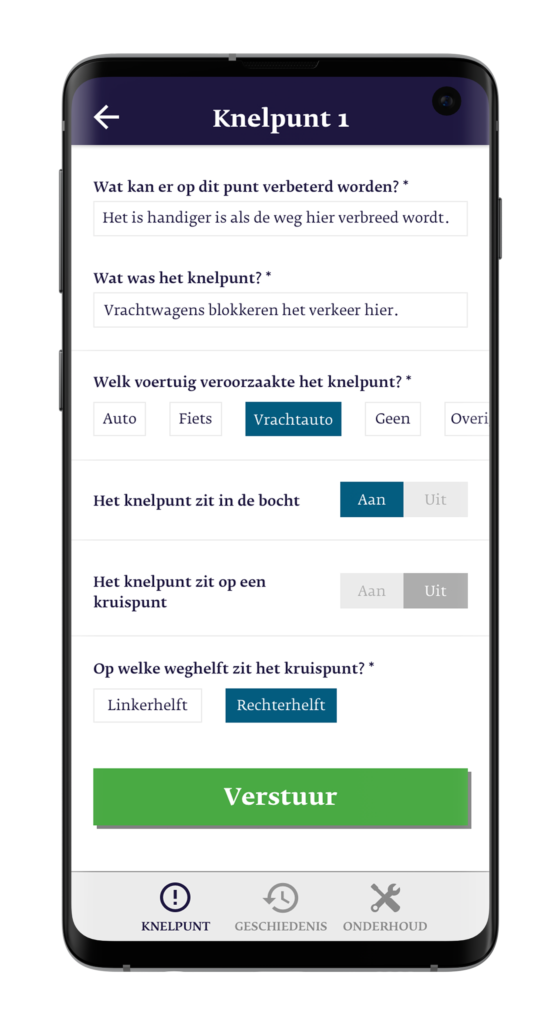 Thuis leggen de gebruikers aan de hand van de locatie het knelpunt verder uit en versturen deze naar de provincie. Ze kunnen hierbij ook oude knelpunten inzien van hunzelf en andere personen. Zo kunnen ze elkaars knelpunten ook aanvullen. Ook bied de app extra informatie over het project van de provincie, te zien in het laatste scherm.