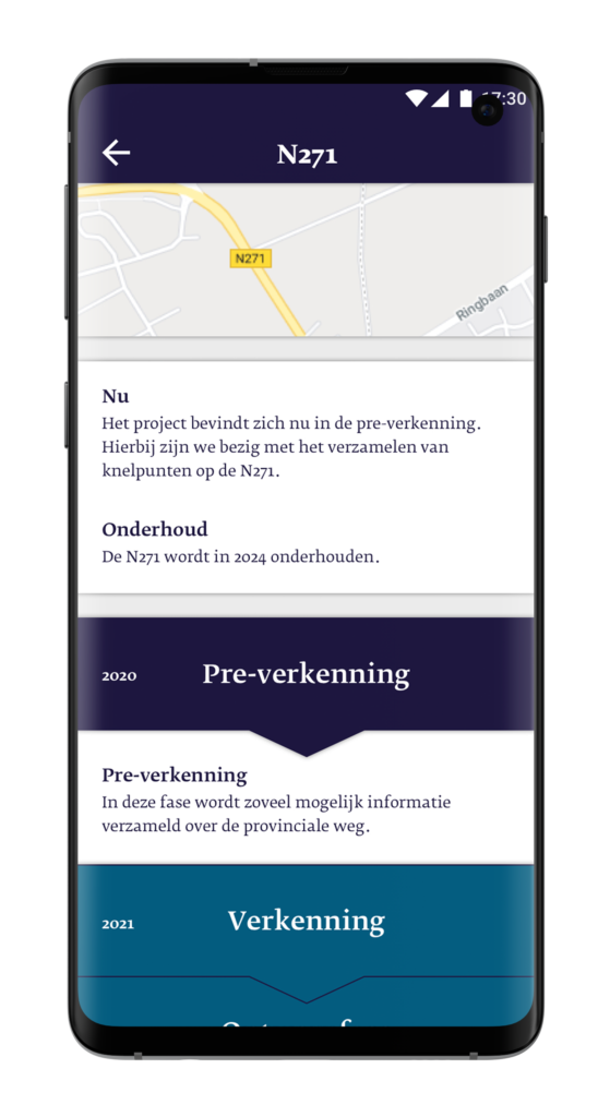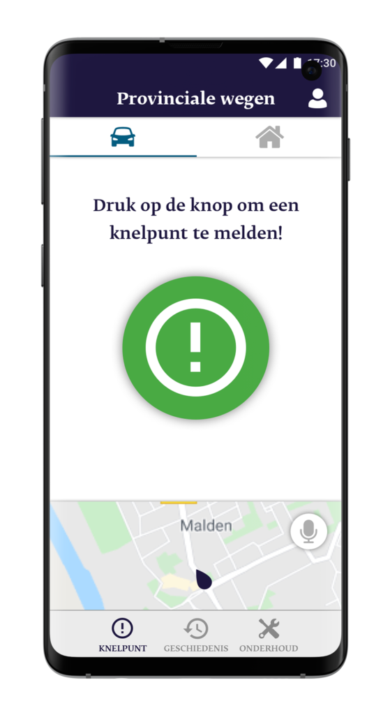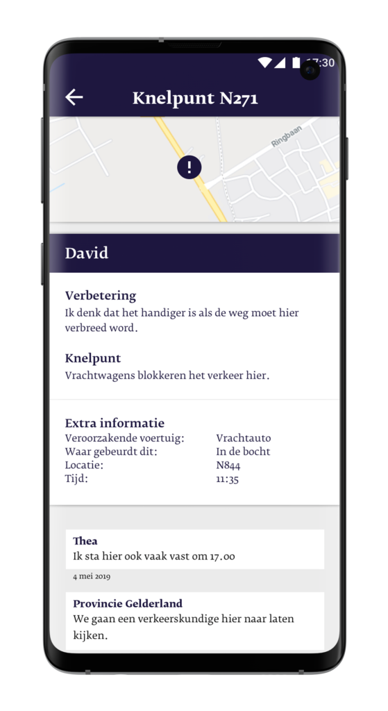 In provincie Gelderland denken burgers alleen in latere stadiums van provinciale projecten mee over hun omgeving. Hier valt het melden van knelpunten op provinciale wegen ook onder. Aan mij was de opdracht om een app te bedenken waarmee burgers aan het begin van een project mee kunnen denken over provinciale wegen.
