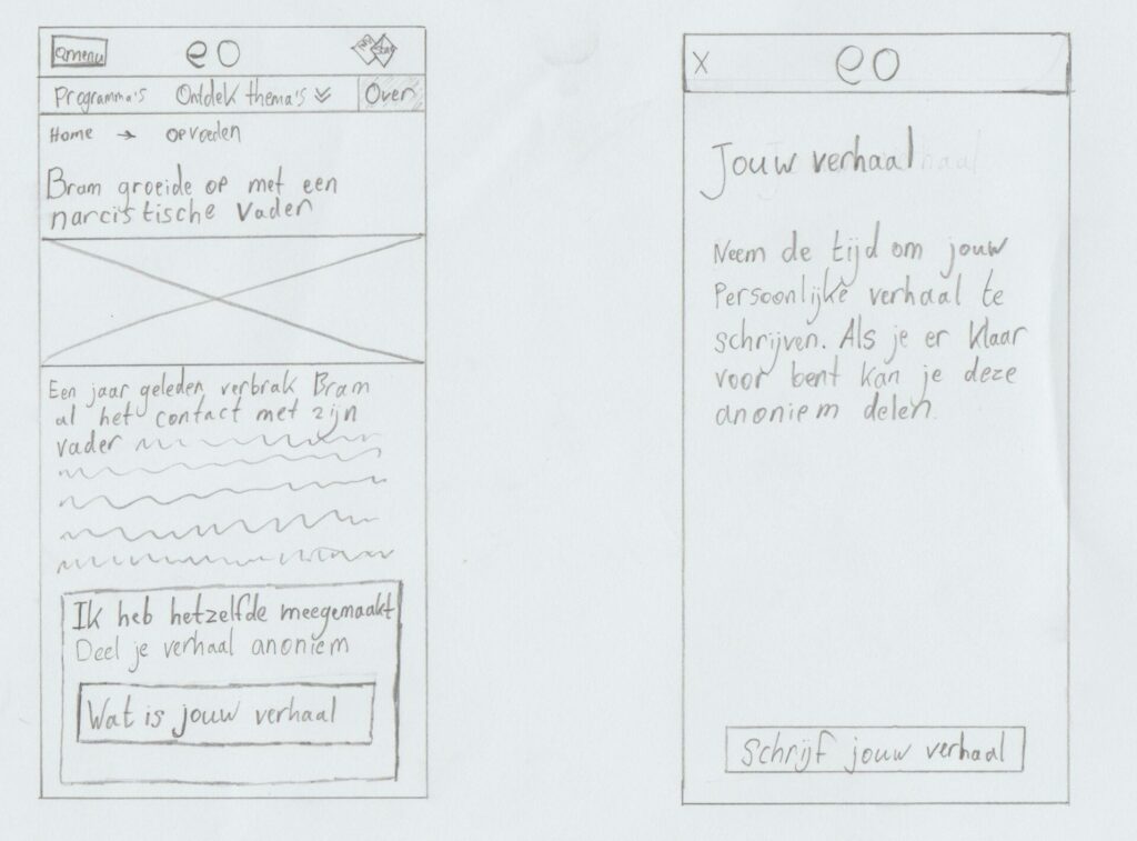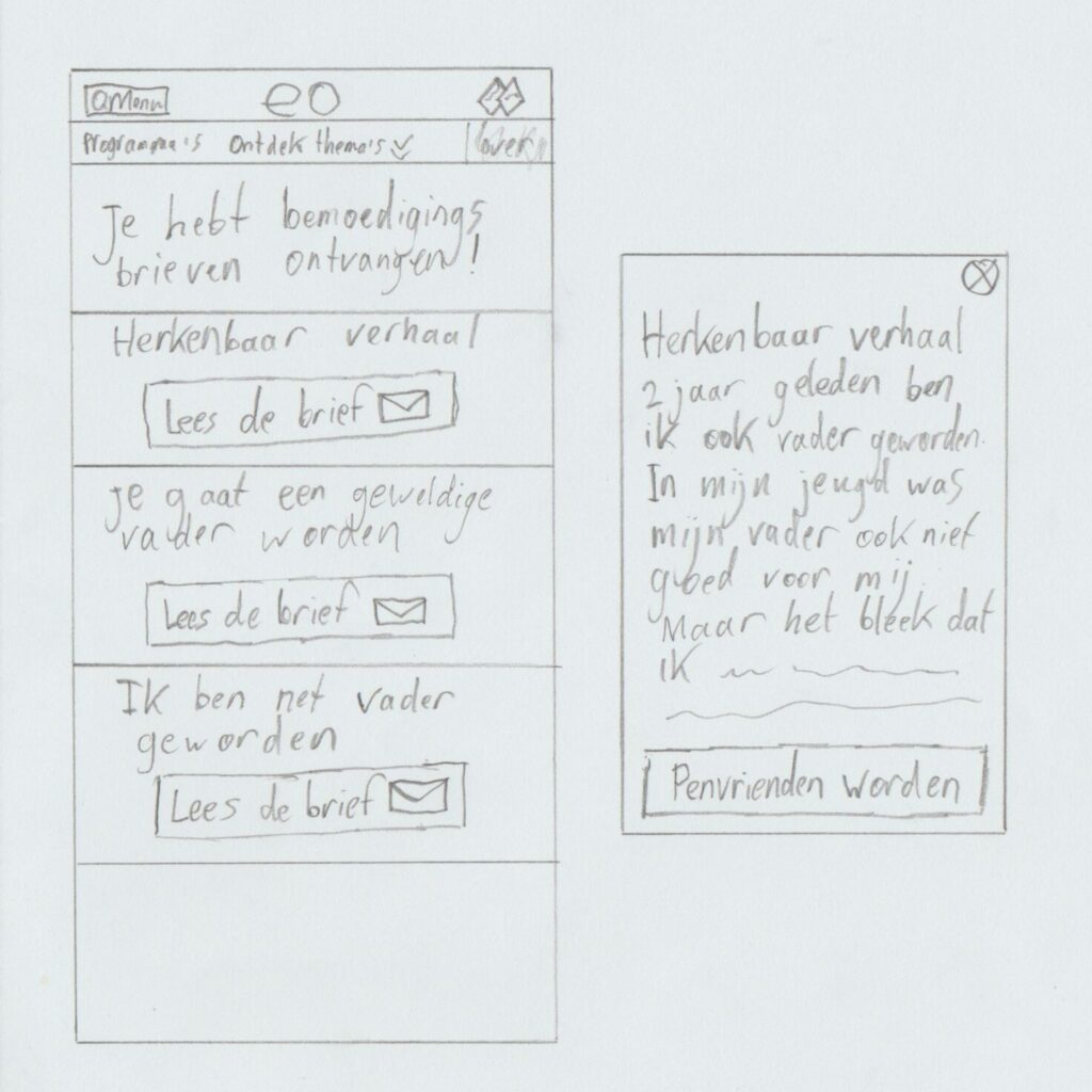 Er is voor de EO een ontwerp gemaakt dat toont hoe verschillende gebruikers samen gebracht worden als penvrienden op de website. In dit ontwerp is er een onderscheid gemaakt tussen gebruikers die hulp zoeken met een persoonlijk probleem en gebruikers die hulp willen bieden. De onderstaande drie ontwerpen laten zien hoe een gebruiker zijn persoonlijk verhaal deelt op de website. Aan de hand van dat ontwerp kan hij een bemoedigingsbrief ontvangen van een andere gebruiker en besluiten om met hem of haar penvrienden te worden.