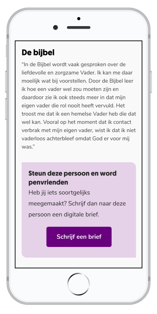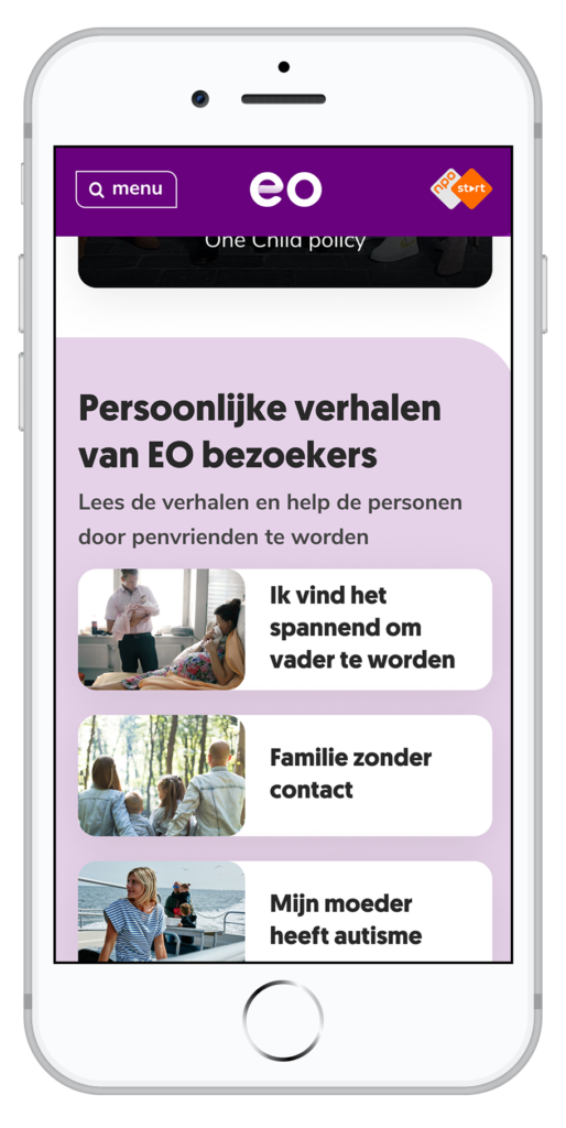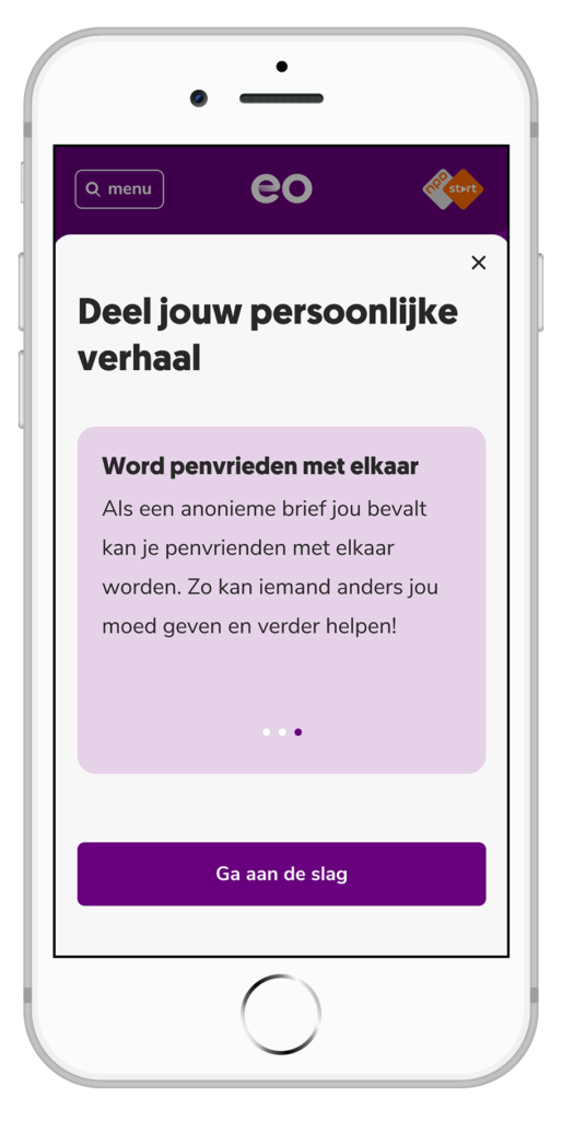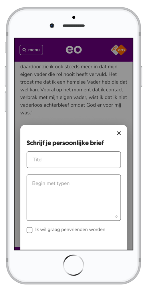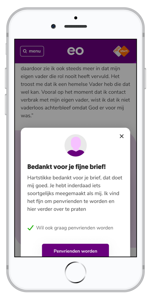 Voor de EO-website heb ik een penvriend optie ontworpen. Dit om te zorgen dat de website bezoekers vaker terugkomen op de website. In de optie delen website bezoekers persoonlijke verhalen met elkaar en worden ze aan de hand van de verhalen met elkaar in contact gebracht.
